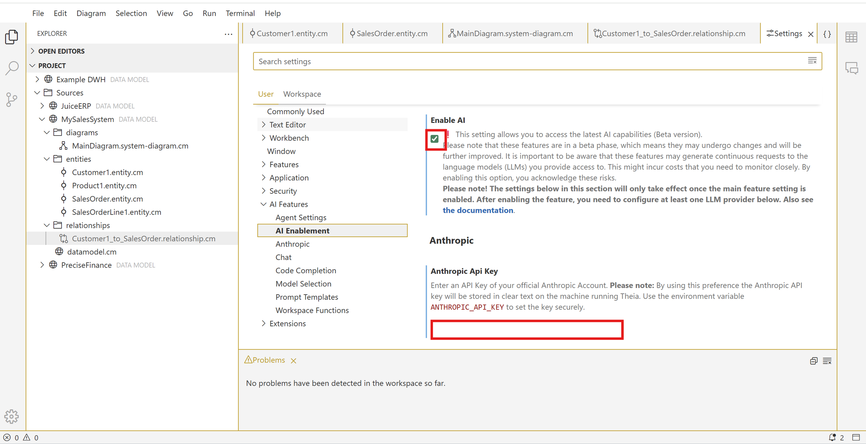 For using the AI modeling assistant it is necessary to enable AI support and supply an API token for a LLM. To do this, go to the menu File → Preferences → Settings.