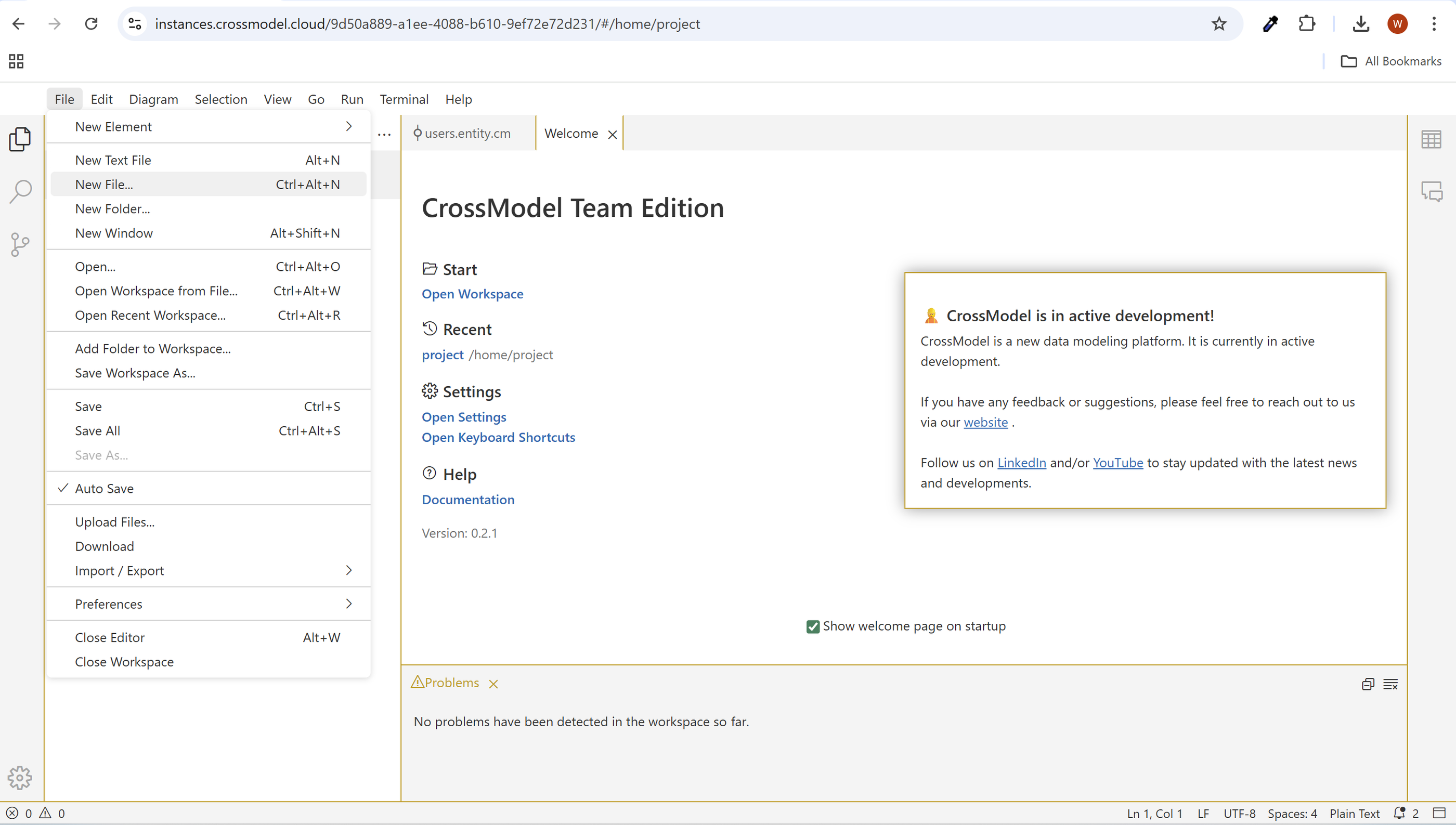 Inspect the result. Notice the modeling assistant has created entities, relationships and also a system diagram. When there are validation errors in the model you can easily fix them in the code perspective.