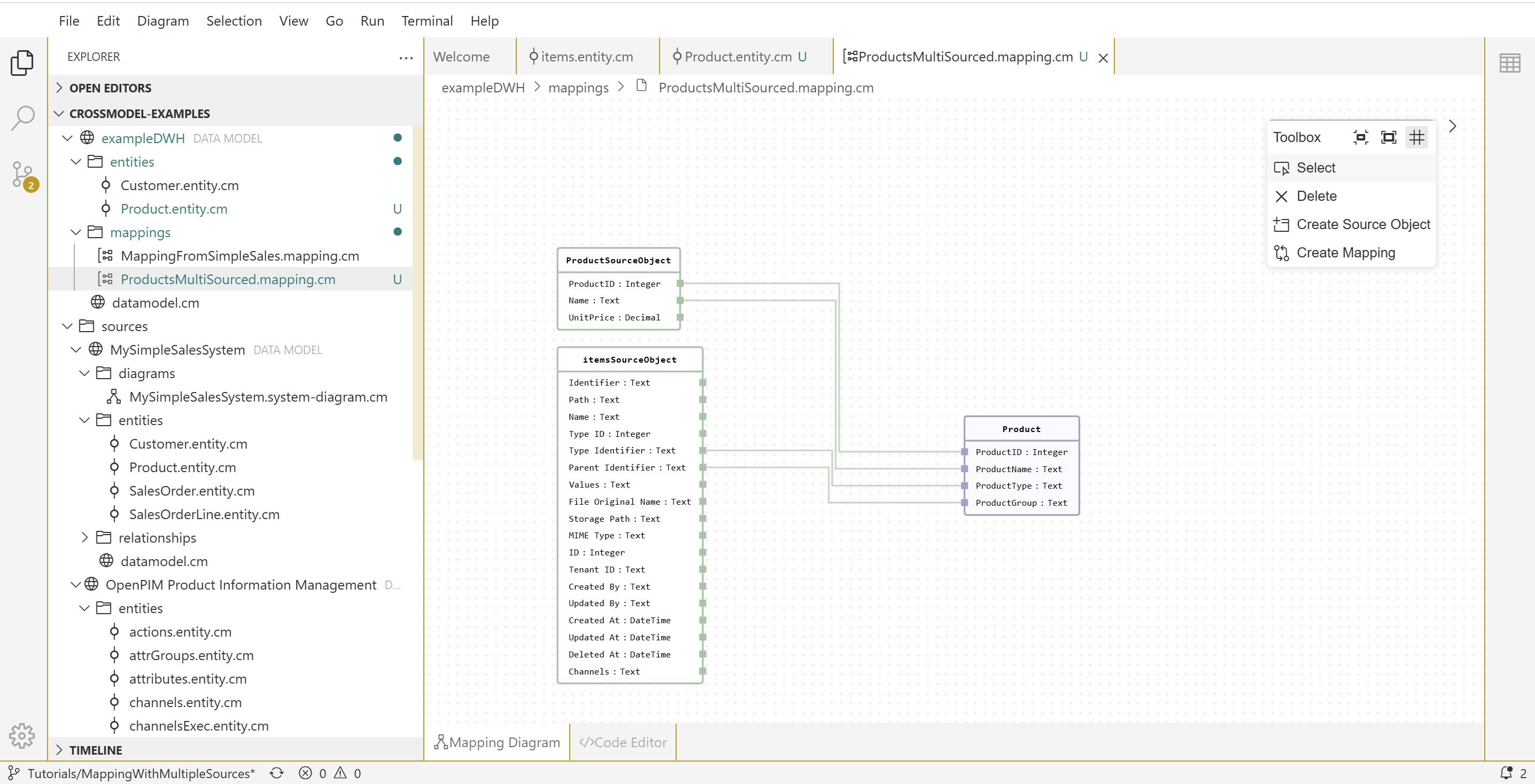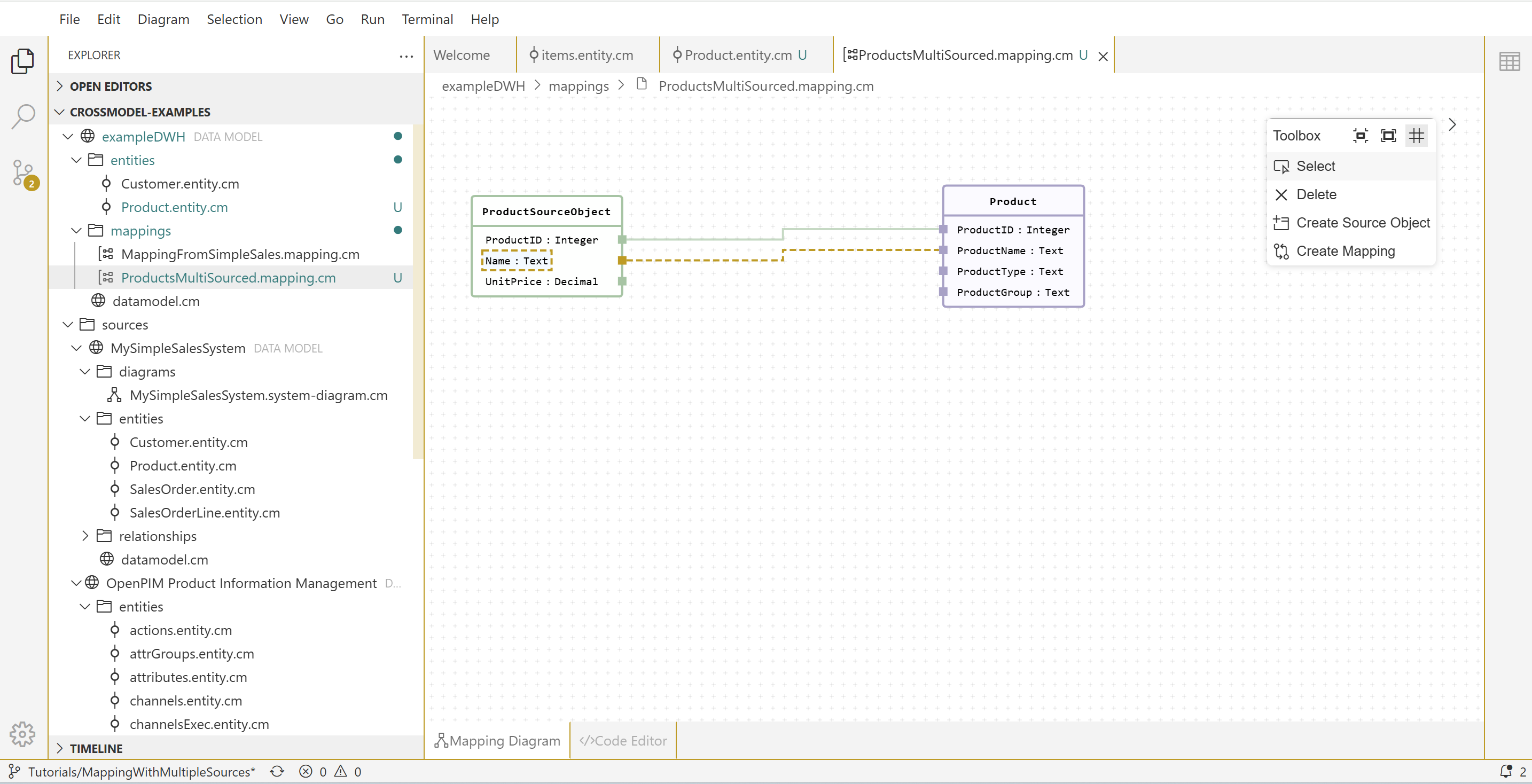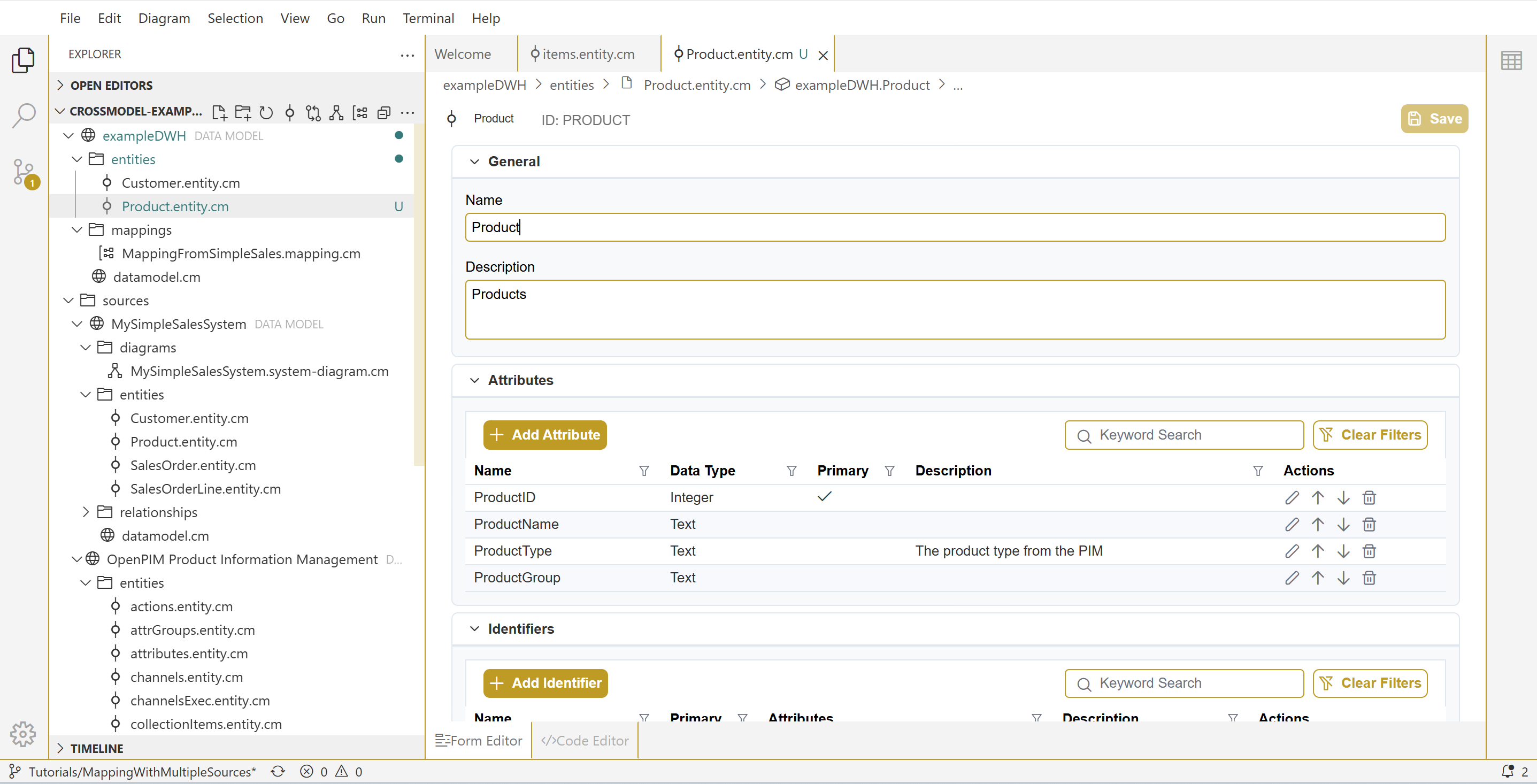 To demonstrate this, we'll extend the ExampleDWH model with a new Product entity that is sourced from MySimpleSalesSystem and OpenPIM.