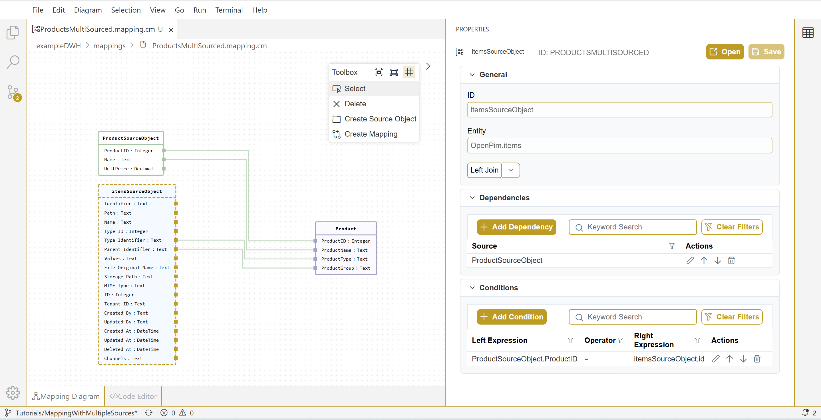 In a mapping that uses more than one source, we need to define how the sources should be related to each other in the context of the mapping. We can define this using the properties panel on the itemSourceObject. First we add ProductSourceObject as a dependency. Then we define the related attributes under conditions: