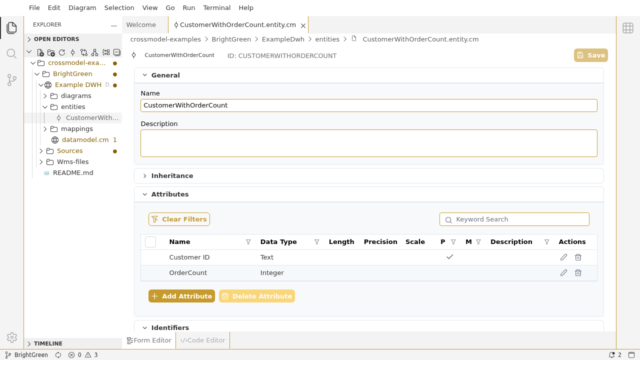 CrossModel offers three ways to view and edit the same model element. With your Customer entity open, try switching between them: