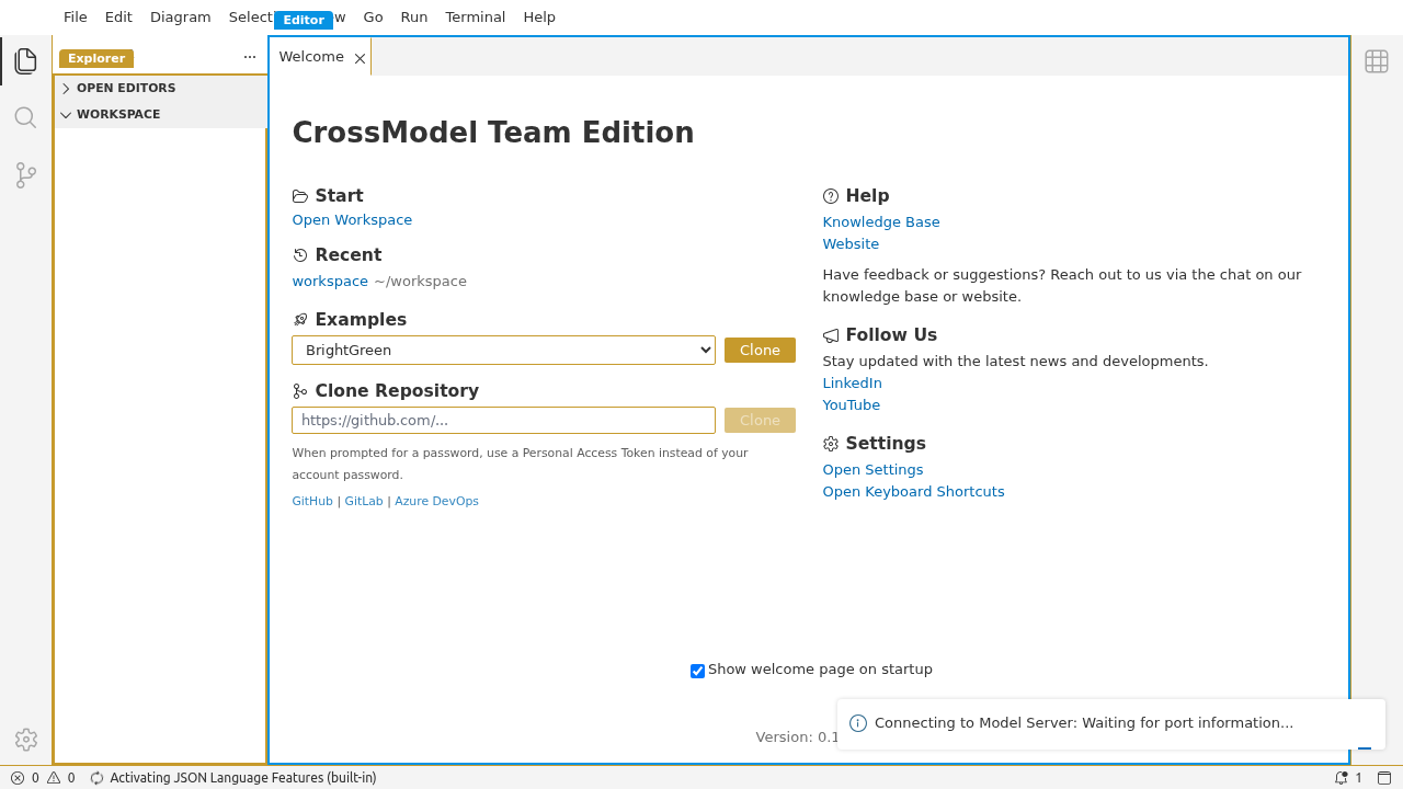 When your workspace opens, you'll see the CrossModel editor. The interface has three main areas: