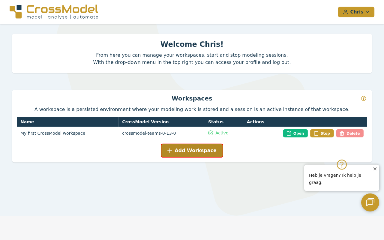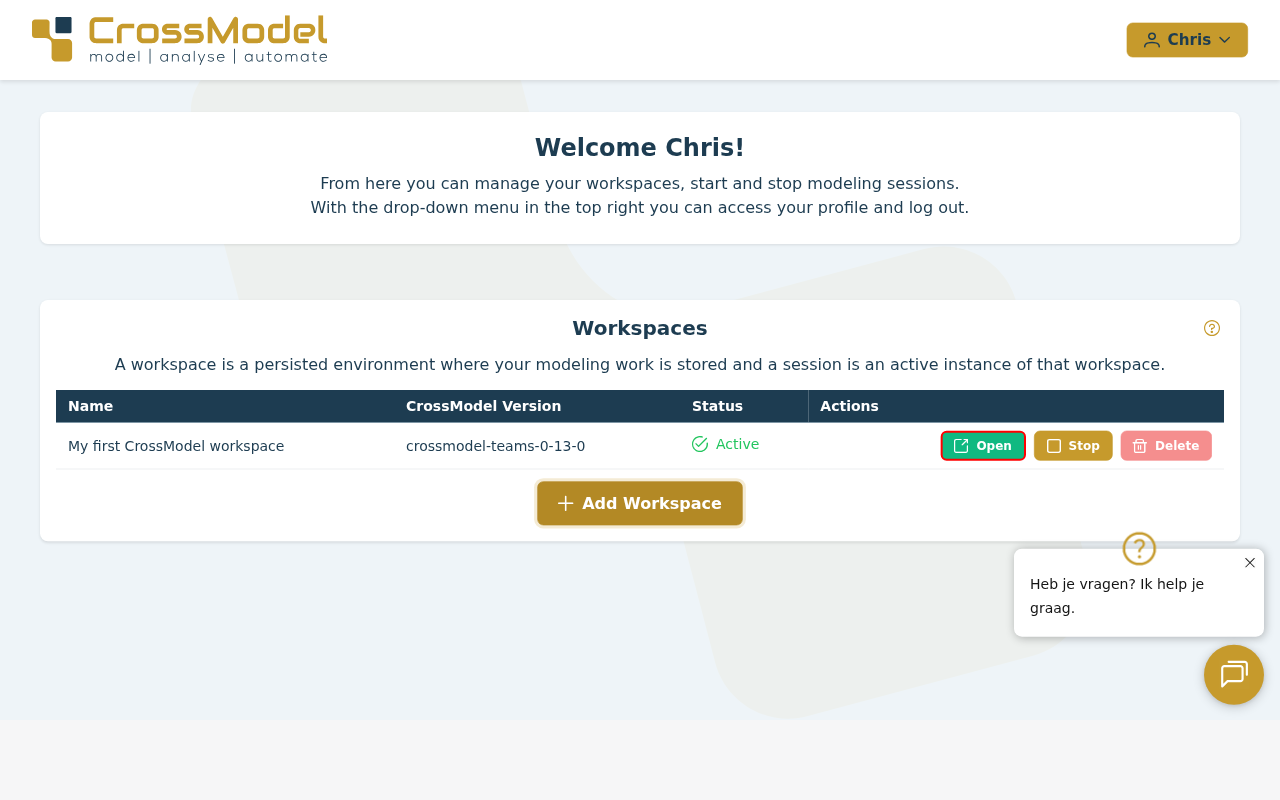 Your workspace now appears in the overview. Press Start to launch it. CrossModel will open in a new browser tab.