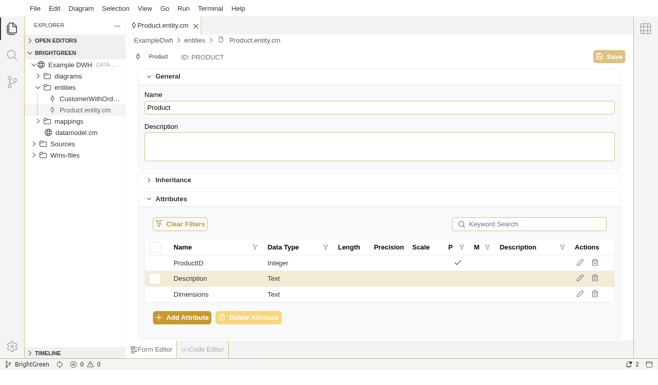 Open the ExampleDWH model and create a new entity Product. Add the following attributes: ProductID (Intger), Description (Text) and Dimensions (Text).