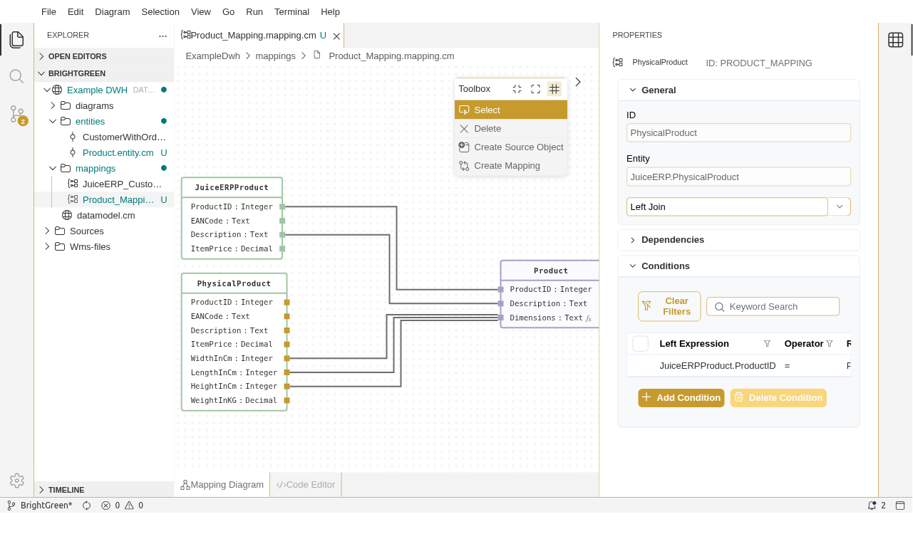 To demonstrate this, we'll extend the ExampleDWH model with a new Product entity that is sourced from JuiceERP.
