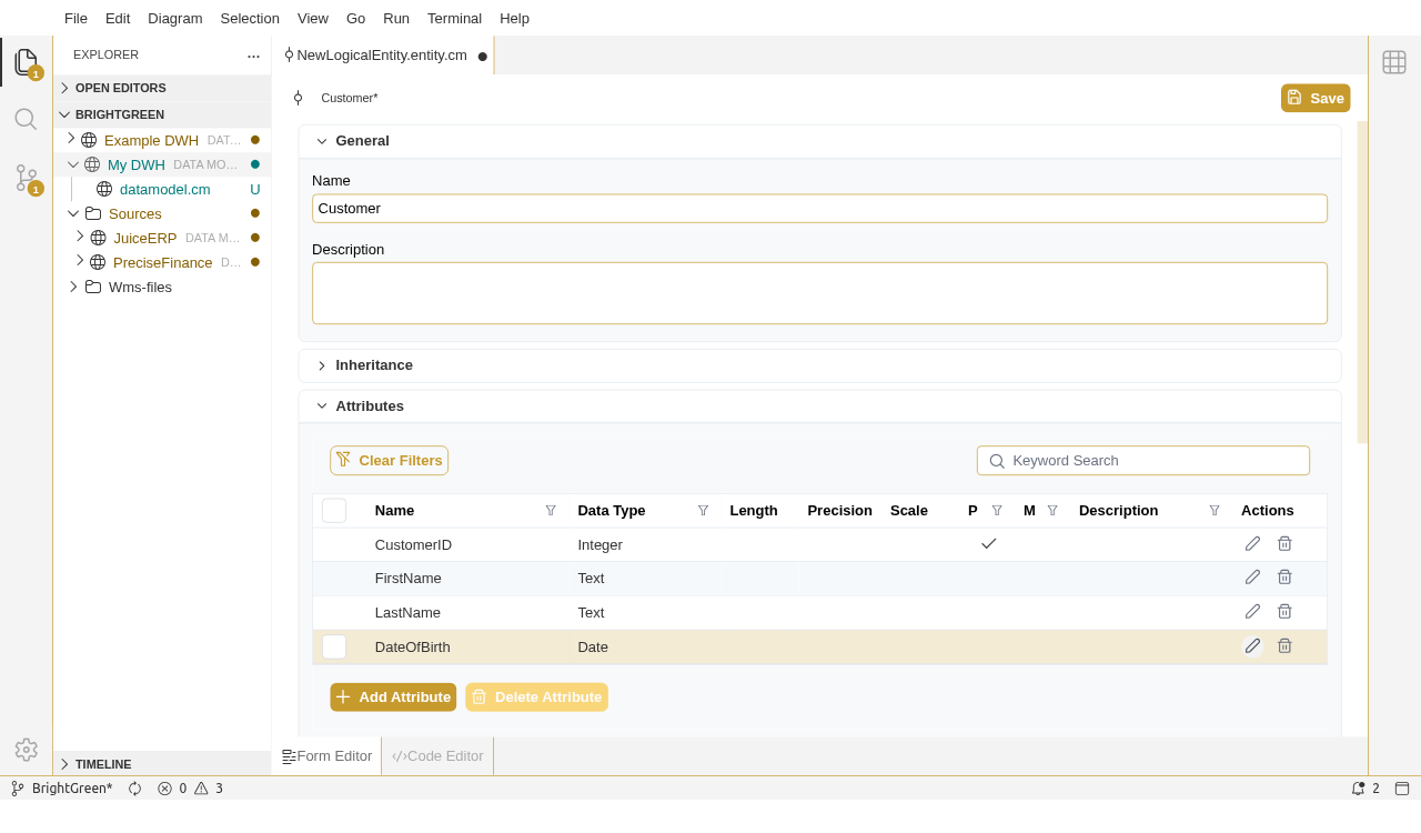 Let's create our first entity in the Datawarehouse; the Customer entity. We'll start with a one to one mapping on the Customer entity from the existing JuiceERP model.